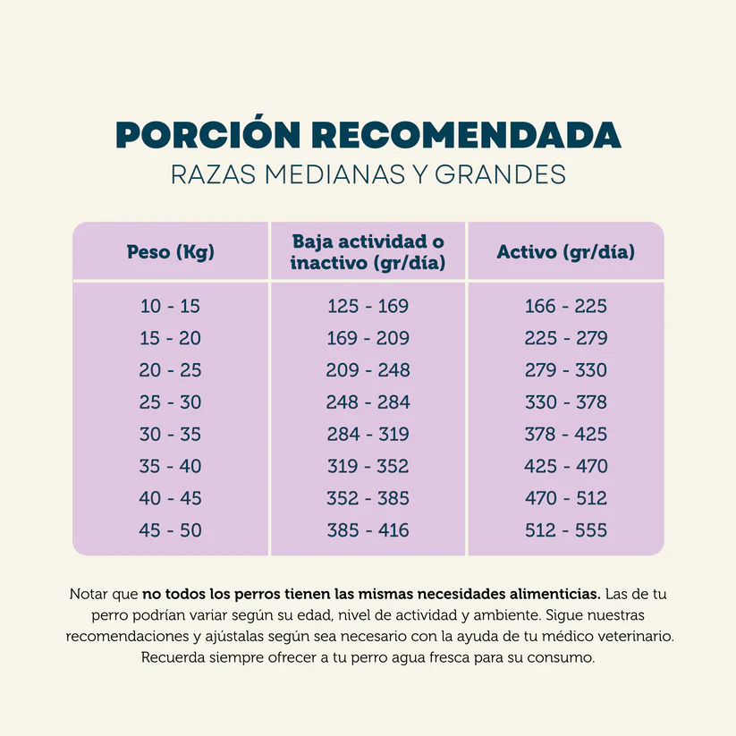 Su presentación en saco de 15 kg resulta ideal para hogares con uno o varios perros, ya que ofrece una excelente relación entre calidad, rendimiento y precio. El tamaño y textura de sus croquetas facilitan la masticación y mejoran la aceptación incluso en perros exigentes.